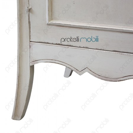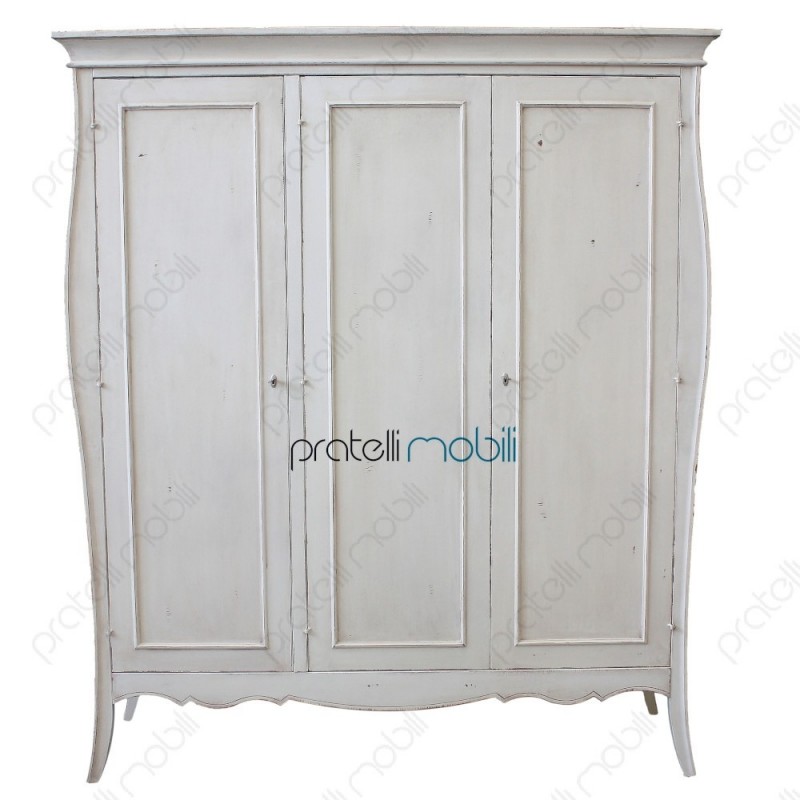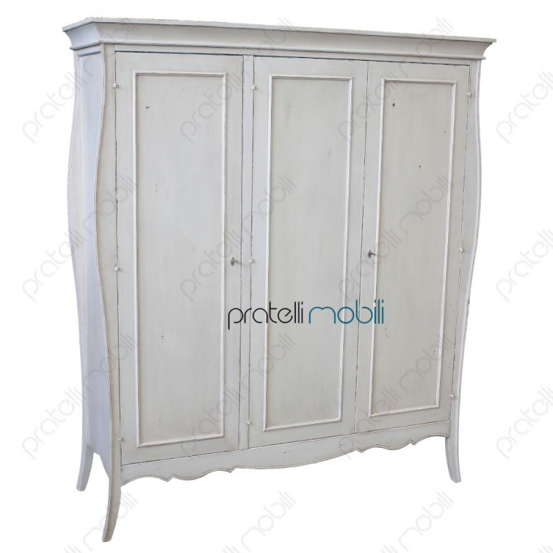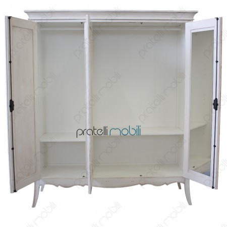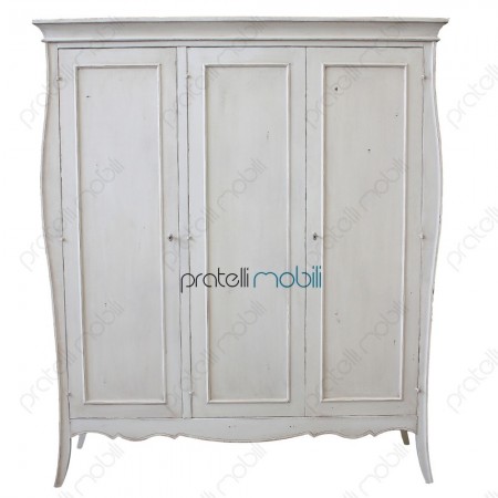 Armadio tre ante stile provenzale shabby chic, rifinito con laccatura manuale in colore bianco anticato con bordi consumati.
