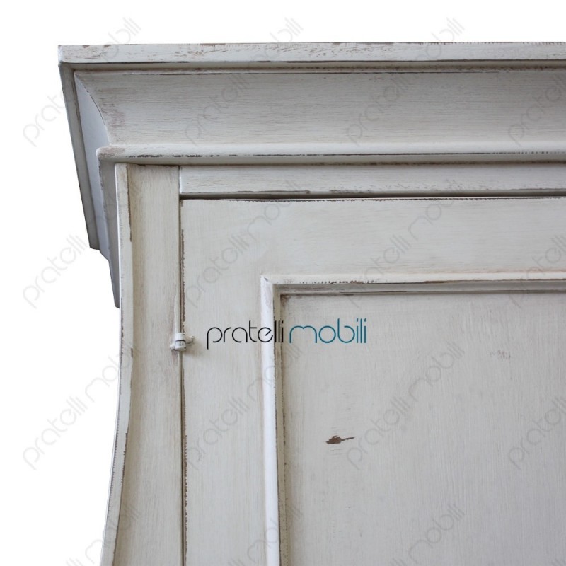 Armadio tre ante dalla forma sagomata, rifinito in stile shabby, colore bianco anticato e consumato. Mobile ideale per arredare camerette per bambini o bad and breakfast.