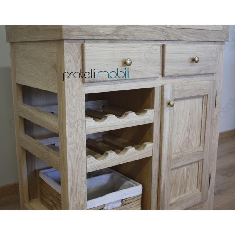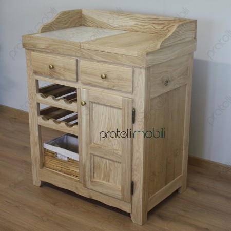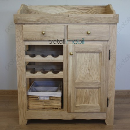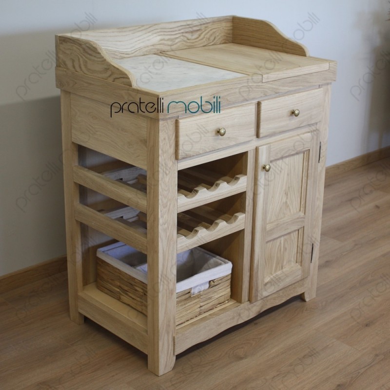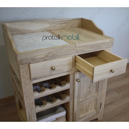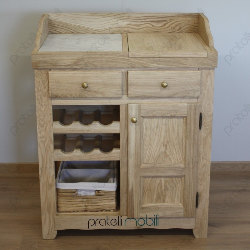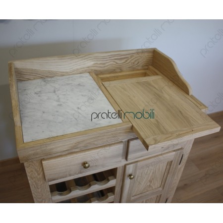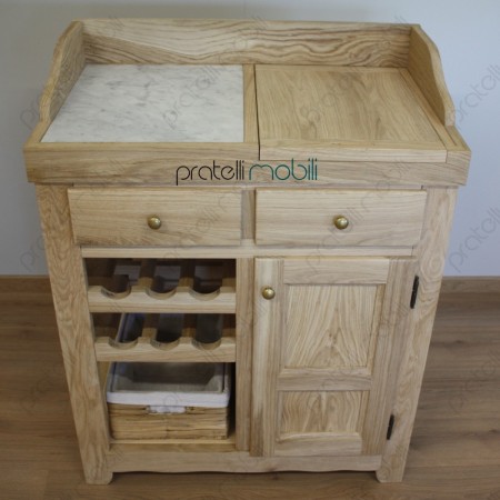 Nella parte superiore è attrezzato con ripiano in marmo e pratico tagliere estraibile, ottimi per la preparazione dei cibi. Al centro, due comodi cassetti offrono ulteriore spazio. La parte inferiore presenta una rastrelliera per bottiglie e un vano dedicato a una cesta, mentre sulla destra si trova un'anta in legno.