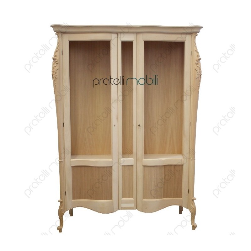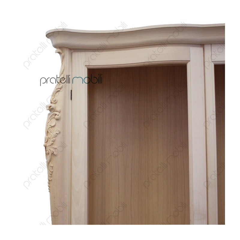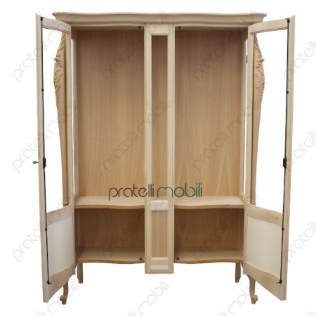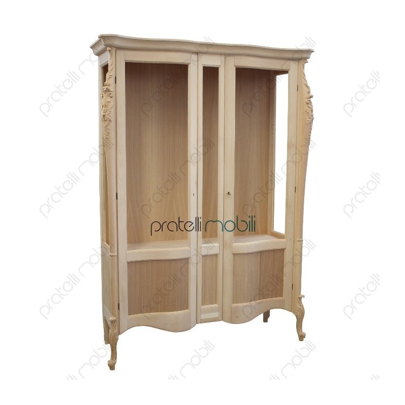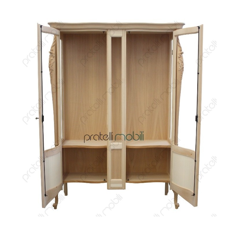 Grande vetrina grezza a 2 ante con parte centrale fissa, mobile in stile barocco moderno arricchito da intagli sulle gambe.
